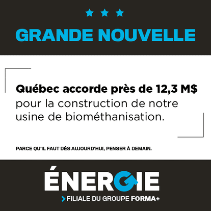 Nous avons le grand plaisir de vous annoncer que le Cabinet du ministre de l'Environnement, de la Lutte contre les changements climatiques, de la Faune et des Parcs a annoncé le 7 juillet dernier l'octroi d'une subvention de près de 12,3M à notre division ÉNERGIE, pour son projet de construction d’une usine de biométhanisation à Salaberry-de-Valleyfield.